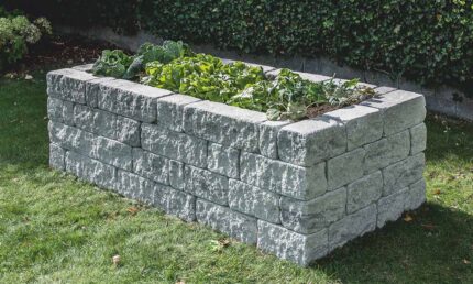Körbefutó éltörés. Minden oldala látszó oldalként is használható. Kerítésrendszer univerzális kőből, vágott félkőből és fedlapból.